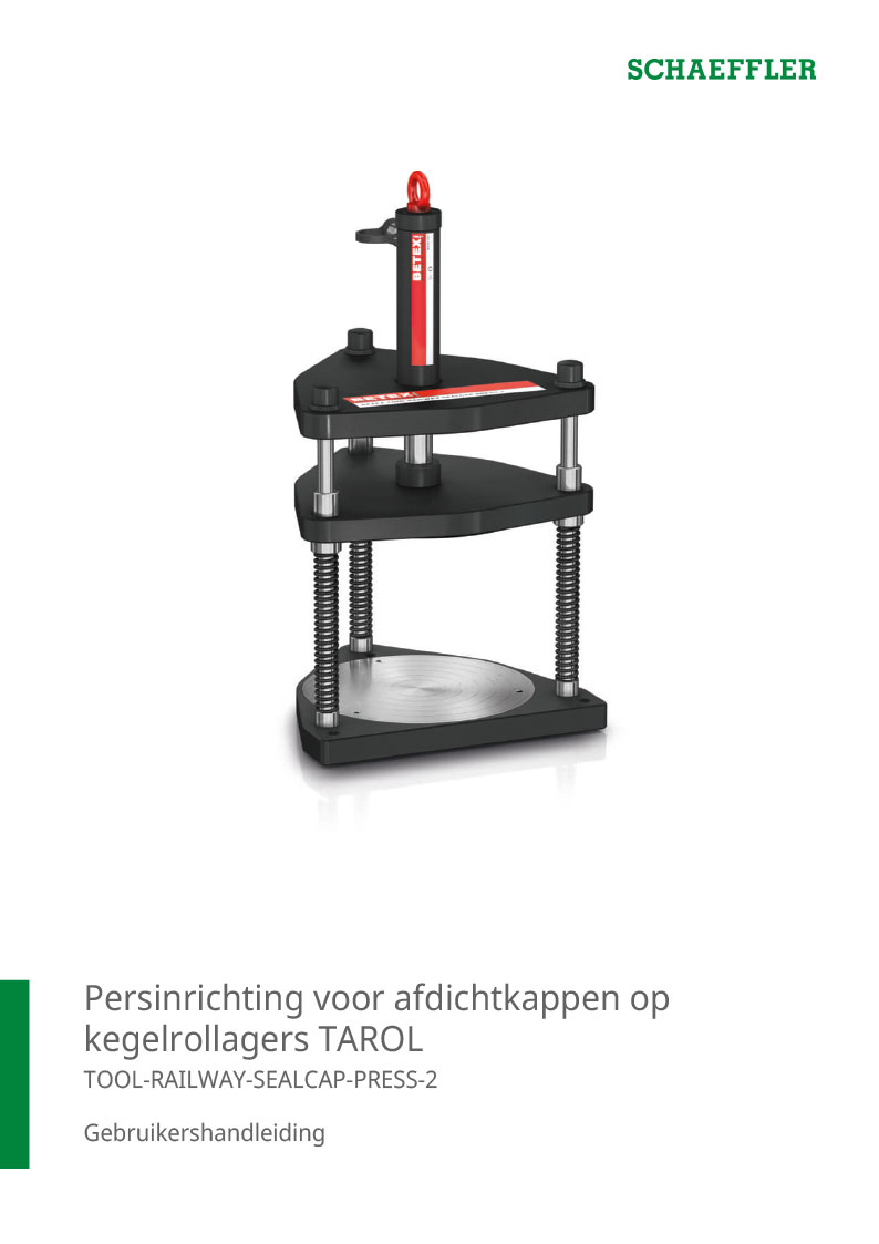 De handleiding bevat instructies voor het aanbrengen en verwijderen van afdichtkappen op wielstellagers van railvoertuigen met de mobiele hydraulische persinrichting TOOL-RAILWAY-SEALCAP-PRESS-2.